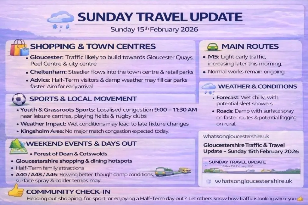 Good morning Gloucestershire! 👋 It’s a quieter start compared to the working week, but with Half-Term now underway, expect traffic levels to increase earlier than a typical Sunday.