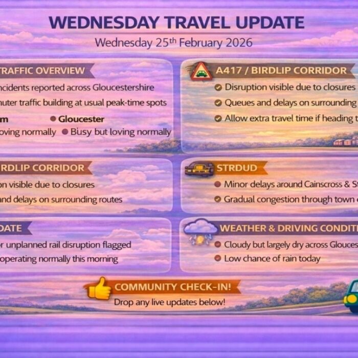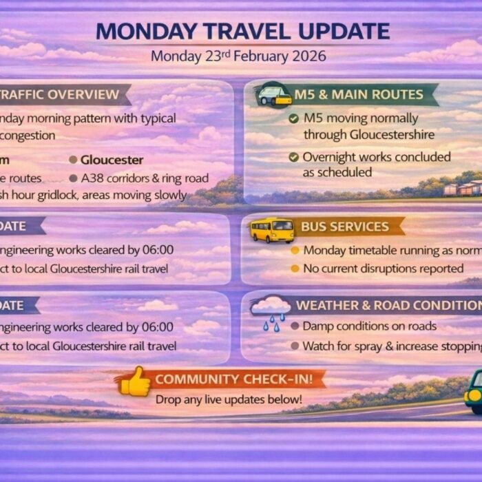 Good morning Gloucestershire.A steady Monday morning across the county with the M5 moving normally, typical peak-time congestion in Cheltenham and Gloucester, and no major incidents currently affecting main...